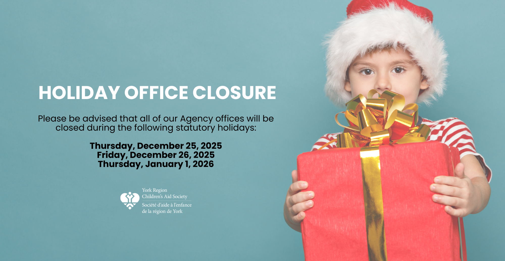 Please be advised that all York Region CAS Agency offices will be closed for the statutory holidays on Thursday, December 25, Friday, December 26, 2025, and Thursday, January 1, 2026.